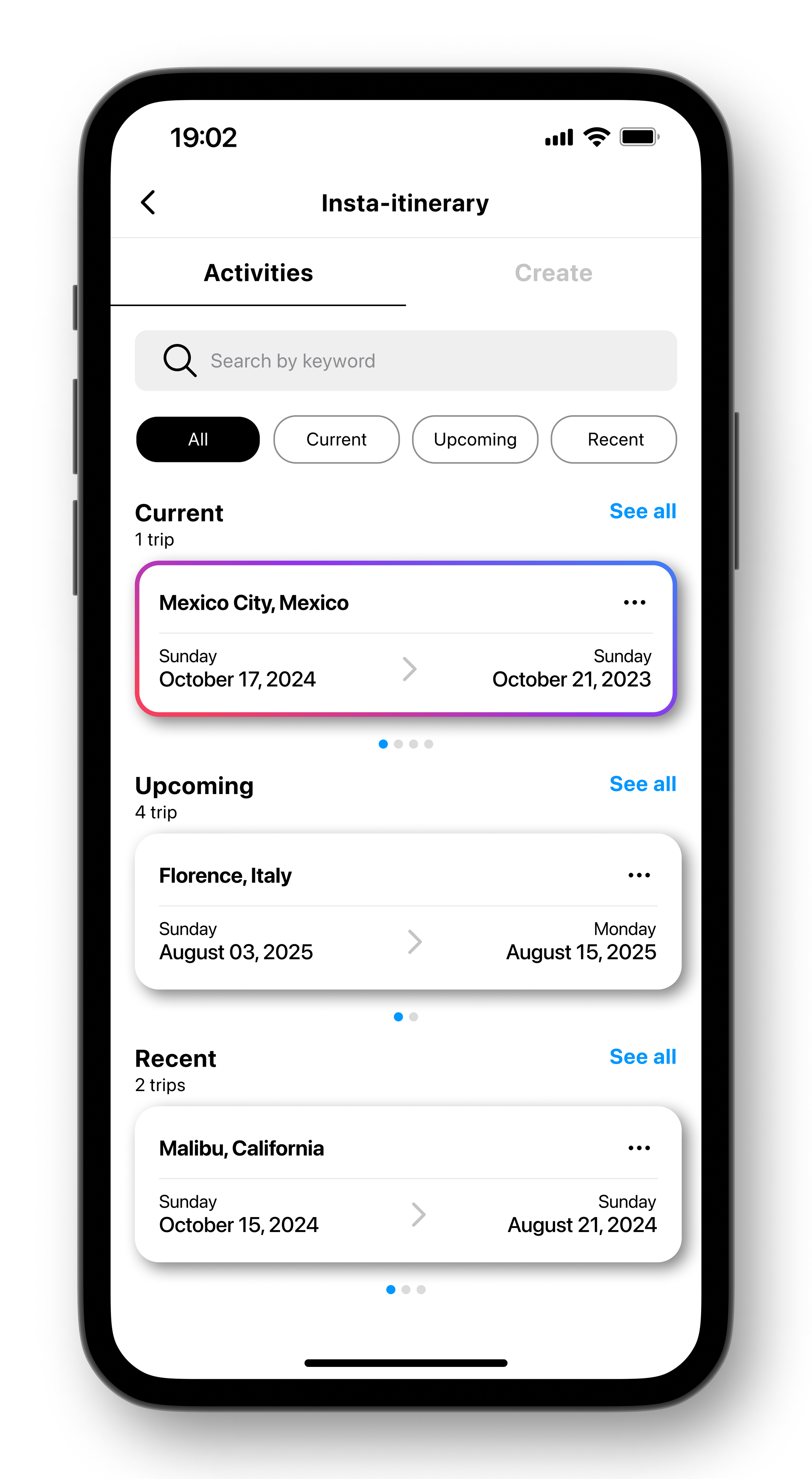 3. compile relevant saved posts into a suggested itinerary, complete with categorized activities, locations, and recommendations, minimizing manual effort and streamlining trip planning
