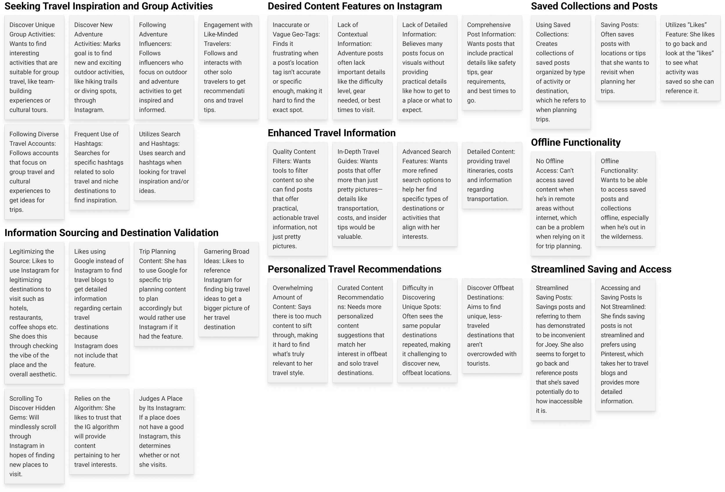 This user persona identifies Adam’s challenges, including inefficient saved post management and lack of practical travel details, while emphasizing his need for streamlined saving, comprehensive content, and collaborative planning tools